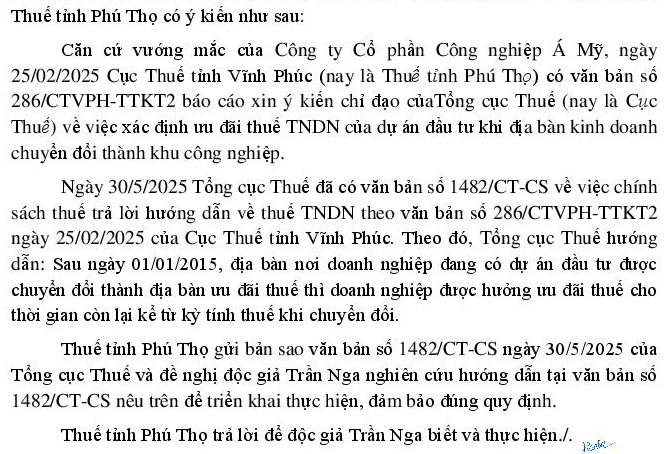 Kính gửi Bộ tài chính : Công ty chúng tôi chính thức hoạt động và phát sinh doanh thu từ tháng 4/2018 cũng trong năm này chung tôi có lãi. Đến tháng 8/2022 Khu vực chúng tôi hoạt động mới có quyết định của Chính Phủ và UBND tỉnh là Khu công nghiệp. Vậy thời điểm xác định ưu đãi theo địa bàn Khu Công nghiệp của chúng tôi được tính từ khi nào ? Căn cứ Khoản 2 Điều 3 Thông tư 78/2014/TT-BTC: Kỳ tính thuế TNDN được xác định theo năm dương lịch hoặc năm tài chính. Điểm 6 Điều 8 Nghị định 126/2020/NĐ-CP: Thuế TNDN được kê khai, quyết toán theo năm. Khoản 1 Điều 13 Thông tư 96/2015/TT-BTC, bổ sung Khoản 2d Điều 23 Thông tư 78/2014/TT-BTC: “Sau ngày 01 tháng 01 năm 2015, địa bàn nơi doanh nghiệp đang có dự án đầu tư được chuyển đổi thành địa bàn ưu đãi thuế thì doanh nghiệp được hưởng ưu đãi thuế cho thời gian còn lại kể từ kỳ tính thuế khi chuyển đổi.” Từ các căn cứ nêu trên, Công ty chúng tôi xác định rằng: • Do địa bàn được công nhận là khu công nghiệp từ tháng 8/2022, nên thời điểm bắt đầu ưu đãi thuế TNDN theo địa bàn ưu đãi là kỳ tính thuế năm 2022. • Do Công ty đã có lãi ngay từ năm đầu tiên (2018), không thuộc trường hợp hoãn tính ưu đãi (3 năm không có thu nhập chịu thuế), nên thời gian ưu đãi được tính liên tục từ năm 2022. • Công ty chúng tôi đang áp dụng ưu đãi giảm 50% số thuế TNDN phải nộp cho năm 2022 và 2023 theo chính sách ưu đãi tại khu công nghiệp. Chúng tôi kính đề nghị Bộ Tài chính xem xét, xác nhận việc xác định kỳ ưu đãi thuế nêu trên có đúng quy định hay không để công ty thực hiện nghĩa vụ thuế đúng và đầy đủ.