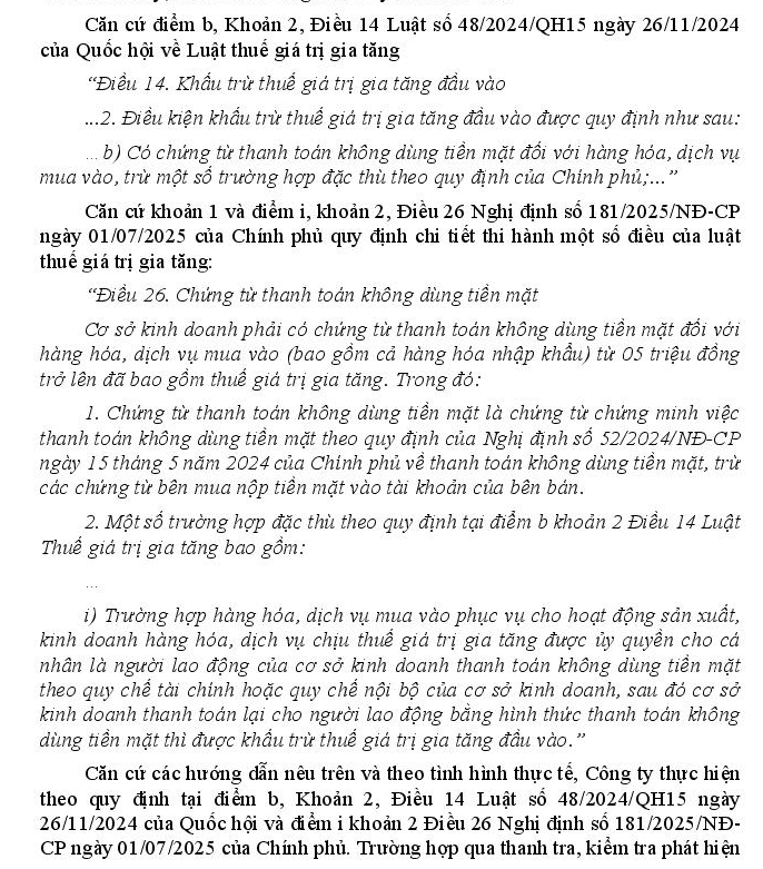 Kính thưa Bộ Tài chính, theo quy định tại Luật thuế số 48/2024 điều kiện khấu trừ thuế GTGT đầu vào được quy định “Có chứng từ thanh toán không dùng tiền mặt đối với hàng hóa, dịch vụ mua vào, trừ một số trường hợp đặc thù theo quy định của Chính phủ” áp dụng từ ngày 01/7/2025, Công ty tôi đang rất băn khoăn, trăn trở về quy định này. Công ty tôi hàng tháng có sử dịch vụ ngoài, các giao dịch có giá trị từ 20 triệu trở lên Công ty có hợp đồng, sau khi hoàn thành công việc mới thanh toán bằng chuyển khoản. Tuy nhiên các giao dịch có giá trị dưới 20 triệu bên bán hàng thường yêu cầu thanh toán ngay như: sửa chữa/khám/đăng kiểm xe, đổ xăng dầu xe chạy hàng ngày, mua vật tư, thiết bị nhỏ lẻ, ăn uống tiếp khách, dịch vụ taxi vận chuyển, vé cầu phà… Như vậy nếu để Công ty thanh toán thì có thể không thực hiện được các giao dịch đó vì bên bán yêu cầu trả tiền ngay, tuy nhiên Công ty chỉ làm việc trong giờ hành chính, ngoài giờ hành chính, ngày nghỉ, lễ, tết cả phía Công ty và ngân hàng đều không làm việc thì không thể chuyển khoản bằng tài khoản của Công ty được. Hỏi: “Trường hợp Công ty cử cán bộ công nhân viên (CBCNV) đi thực hiện công việc của Công ty, CBCNV đó thực hiện thanh toán tiền cho nhà cung cấp bằng tài khoản cá nhân (không dùng tiền mặt), sau đó Công ty thanh toán lại cho nhân viên qua tài khoản ngân hàng của Công ty kèm theo đầy đủ chứng từ gồm: giấy đề nghị thanh toán, hóa đơn, hợp đồng, chứng từ chuyển tiền…”có được coi là đáp ứng điều kiện chứng từ thanh toán không dùng tiền mặt để khấu trừ thuế GTGT đầu vào theo quy định tại Luật 48/2024/QH15 không?”