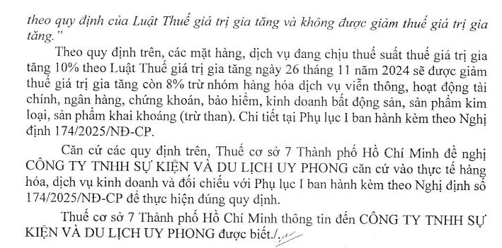 Kính gửi: Thuế Thành Phố Hồ Chí Minh - Doanh nghiệp có MST 0317633298, ngày 09/07/2025 có đặt cọc mua 01 máy CNC gia công tượng xốp của CÔNG TY TNHH DỊCH VỤ THƯƠNG MẠI KỸ THUẬT MAI LINH (MST: 0317888842), mã ngành chính 4659 Bán buôn máy móc, thiết bị và phụ tùng máy khác. Chi tiết: Bán buôn máy móc, thiết bị và phụ tùng máy khai khoáng, xây dựng; Bán buôn máy móc, thiết bị điện, vật liệu điện (máy phát điện, động cơ điện, dây điện và thiết bị khác dùng trong mạch điện); Bán buôn máy móc, thiết bị và phụ tùng máy dệt, may, da giày; Bán buôn máy móc, thiết bị và phụ tùng máy văn phòng (trừ máy vi tính và thiết bị ngoại vi); Bán buôn máy khắc CNC (khắc gỗ, cắt quảng cáo khắc đá, đồng), máy khắc laser, máy quét 3D, máy cắt plasma, máy cắt CNC, mắt cắt laser. - Doanh nghiệp muốn hỏi về thuế suất của mặt hàng máy móc CNC này là chịu thuế suất (8% hay 10%) vì người bán có thông báo là do linh kiện nhập khẩu với thuế suất 10% nên hóa đơn bán ra của máy CNC này cũng là 10% mà không được hưởng ưu đãi về thuế GTGT theo Nghị quyết 204/2025/QH15, Nghị định 174/2025/NĐ-CP thì có đúng qui định không? - Khi tra cứu sản phẩm, hàng hóa, dịch vụ có được hưởng ưu đãi về thuế GTGT hay không thì doanh nghiệp sẽ dựa vào mã ngành hay sản phẩm cuối cùng, hay dựa vào tiêu chí nào khác để có thể tra cứu thông tin chính xác nhất. Rất mong cơ quan thuế có văn bản hoặc ý kiến hướng dẫn để doanh nghiệp thực hiện đúng nghĩa vụ thuế và đúng quy định pháp luật hiện hành, nhằm tạo điều kiện thuận lợi trong công việc kê khai, đối chiếu thuế. Xin trân trọng.