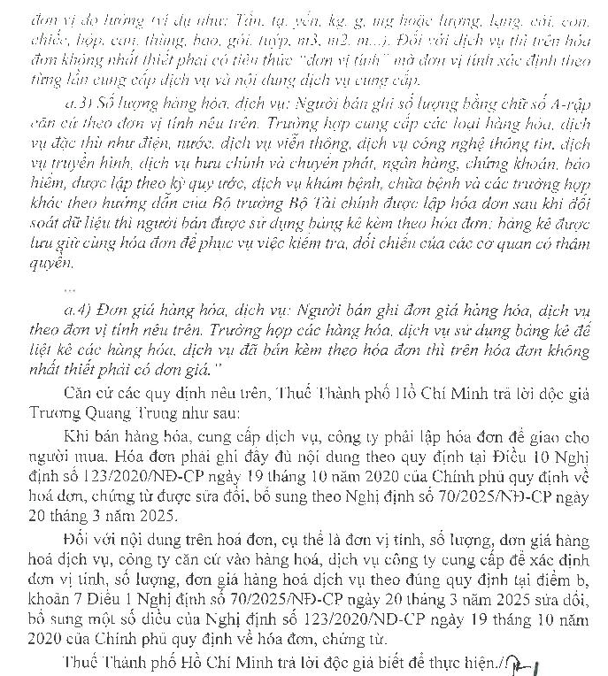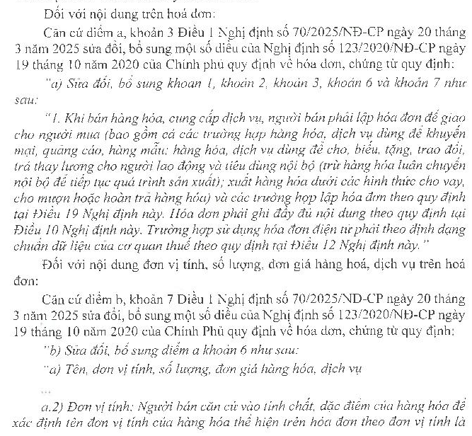 Kính gửi Bộ Tài chính, Tổng cục Thuế, Cty chúng tôi đang hoạt động trong lĩnh vực siêu thị và đang có vướng mắc với khách hàng liên quan đến việc xuất hóa đơn, cụ thể ở tiêu thức Đơn vị tính, Số lượng, Đơn giá. Cụ thể tôi xin trình bày như sau: Cty chúng tôi có ký Thỏa thuận hỗ trợ khi mua hàng với Nhà cung cấp(NCC), theo đó NCC sẽ hỗ trợ các khoản như: Hỗ trợ tiếp thị, Hỗ trợ trưng bày sản phẩm, Hỗ trợ bán hàng…Với giá trị dựa theo tỷ lệ % trên doanh số bán hàng hàng tháng. Chúng tôi hiểu rằng, đây là 1 hoạt động dịch vụ mà chúng tôi cung cấp cho NCC của mình. Để thu tiền, Cty chúng tôi xuất hóa đơn cho NCC với nội dung của khoản hỗ trợ và thành tiền, không điền thông tin ở tiêu thức đơn vị tính, số lượng, đơn giá. ví dụ: Hỗ trợ tiếp thị 0.5%. Số tham chiếu: Tháng 8.2025. Do chúng tôi cung cấp rất nhiều loại dịch vụ cho NCC nên có rất nhiều loại đơn vị tính khác nhau, để thuận tiện khi xuất hóa đơn chúng tôi không ghi thông tin ở tiêu thức đơn vị tính, đơn giá, số lượng. Cách làm này chúng tôi dựa vào quy định tại điểm b khoản 7 điều 1 Nghị Định 70/2025/NĐ-CP để thực hiện “ Đối với dịch vụ thì trên hóa đơn không nhất thiết phải có tiêu thức “đơn vị tính” mà đơn vị tính xác định theo từng lần cung cấp dịch vụ và nội dung dịch vụ cung cấp.” Hiện tại, NCC của chúng tôi không đồng ý các hóa đơn xuất thiếu thông tin ở tiêu thức đơn vị tính, số lượng, đơn giá. Họ đã làm công văn số 384/2025/AV-VL/KT ngày 28/08/2025 và được Thuế Tỉnh Vĩnh Long phúc đáp bằng công văn số 647/VLO-QLDN1 ngày 12/09/2025. Trong công văn phúc đáp Thuế Tỉnh Vĩnh Long có đoạn “Trường hợp cơ sở kinh doanh lập hóa đơn điện tử khi nhận tiền hỗ trợ theo quy định của pháp luật thì tiêu thức đơn vị tính, số lượng, đơn giá trên hoá đơn phải ghi đầy đủ nội dung theo quy định tại điểm b khoản 7 Điều 1 Nghị Định số 70/2025/NĐ-CP…”. Cùng căn cứ vào cùng 1 điểm theo Nghị Định70/2025/NĐ-CP nhưng lại cơ quan Thuế Tỉnh Vĩnh Long lại có quan điểm trái ngược hoàn toàn với quy định tại Nghị Định làm chúng tôi rất phân vân. Kính mong Bộ Tài Chính, Tổng Cục Thuế xem xét, hướng dẫn và cho ý kiến để công ty chúng tôi hiểu rõ và thực hiện đúng quy định. Xin chân thành cảm ơn!