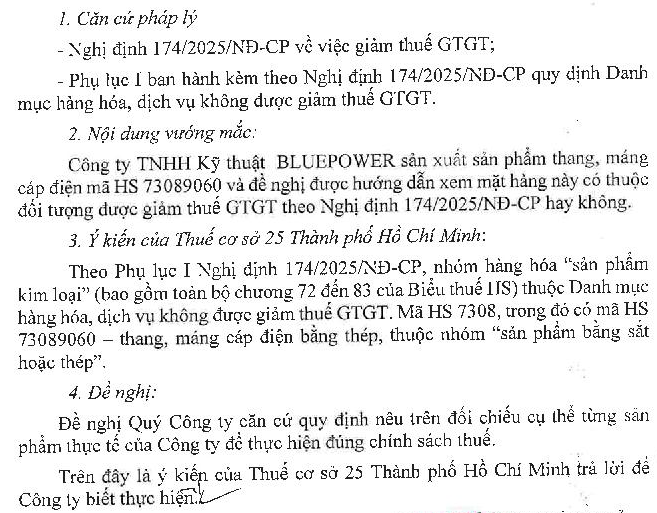 Kính gửi Bộ Tài chính. theo Nghị định 174/2025/NĐ-CP ngày 30 tháng 6 năm 2025 về việc giảm thuế GTGT. Công ty tôi có một số vướng mắc như sau: Công ty tôi sản xuất sản phẩm thang, máng cáp điện (mã HS 73089060) không nằm trong danh mục không được giảm thuế GTGT. Về quy trình sản xuất chỉ dập gia công từ thép tấm và sơn tĩnh điện nên không tính là gia công quá mức. Nay xin cho công ty chúng tôi hỏi: Sản phẩm thang máng cáp này có được giảm thuế GTGT hay không?