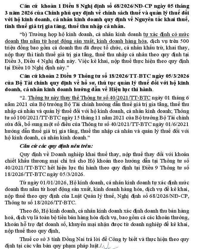 Kính Gửi Bộ Tài Chính. Công ty em sản xuất thức ăn chăn nuôi, thuế GTGT là KCT, Công Ty có ký kết thỏa thuận chi trả chiết khấu thương mại hàng tháng cho cá nhân kinh doanh/ hộ kinh doanh (có vài cá nhân kinh doanh chưa đăng ký hộ kinh doanh ) khi đạt sản lượng, công ty có thực hiện kê khai thay và nộp thuế TNCN thay theo tờ khai mẫu số 01/CNKD TT40/2021 Hàng tháng Công ty đã kê khai và nộp thuế thay đều được, tuy nhiên năm 2026 xóa bỏ hộ khoán, em chưa rõ là công ty có phải kê khai và nộp thuế thay hàng tháng nữa không, hay chuyển sang kê khai theo quý/ năm ạ vì kế từ kỳ thuế tháng 01/2026 không nộp được tờ khai này như những năm trước được nữa. Em xin trân trọng cảm ơn.