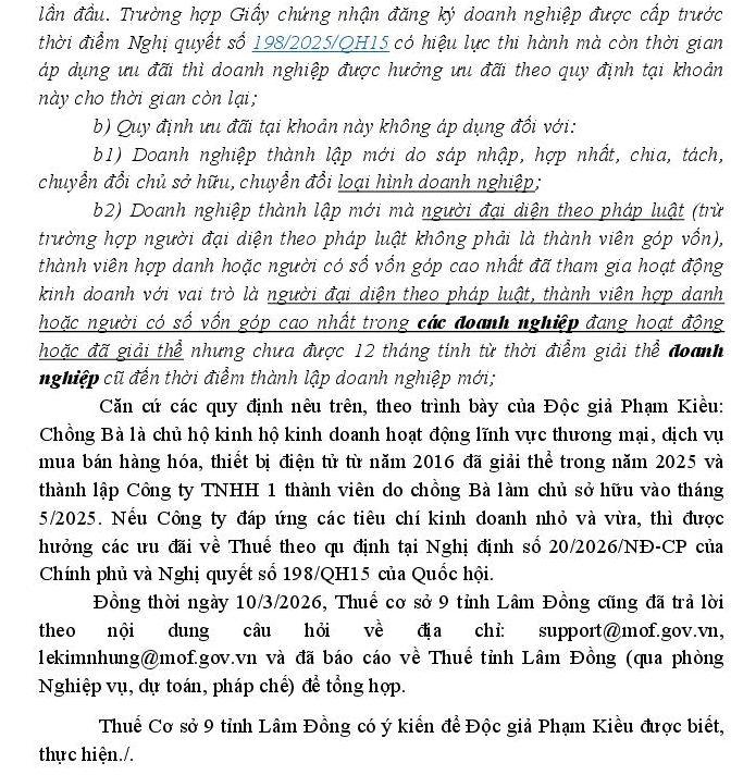 Xin hỏi BTC: Chồng tôi là chủ hộ kinh doanh hoạt động lĩnh vực thương mại, dịch vụ mua bán hàng hóa, thiết bị điện tử từ năm 2016. Đến tháng 5.2025 chồng tôi làm thủ tục chấm dứt hoạt động hộ kinh doanh, sau đó thành lập công ty TNHH 1 thành viên do chồng tôi làm chủ sở hửu cũng vào tháng 5.2025, cũng hoạt động lĩnh vực như hộ kinh doanh cũ và đăng ký kinh doanh tại địa điểm của HKD cũ luôn. Công ty đáp ứng các tiêu chí doanh nghiệp nhỏ và vừa. Vậy xin hỏi BTC theo Nghị định 20/2026/NĐ-CP và Nghị quyết 198/QH15 thì trường hợp công ty của chồng tôi là giả thể HKD và thành lập doanh nghiệp trong cùng 1 năm, hoạt động tại cùng một địa điểm kinh doanh và cùng ngành nghề, cùng 1 người chủ sở hửu thì có được hưởng ưu đãi thuế TNDN 03 năm đầu không? Tôi có hỏi cán bộ thuế khu vực về trường hợp công ty chồng tôi tình trạng như trên nhưng cán bộ thuế trả lời do cùng 1 người đại diện pháp luật, cùng 1 địa điểm kinh doanh, cùng 1 ngành nghề kinh doanh nên không được miễn thuế TNDN 3 năm đầu. Tôi đọc trong Nghị định 20/2026/NĐ-CP và Nghị quyết 198/QH15 thì không nhắc tới trường hợp như cán bộ thuế khu vực giải thích. Xin BTC trả lời rõ giúp tôi vấn đề này Xin cảm ơn!